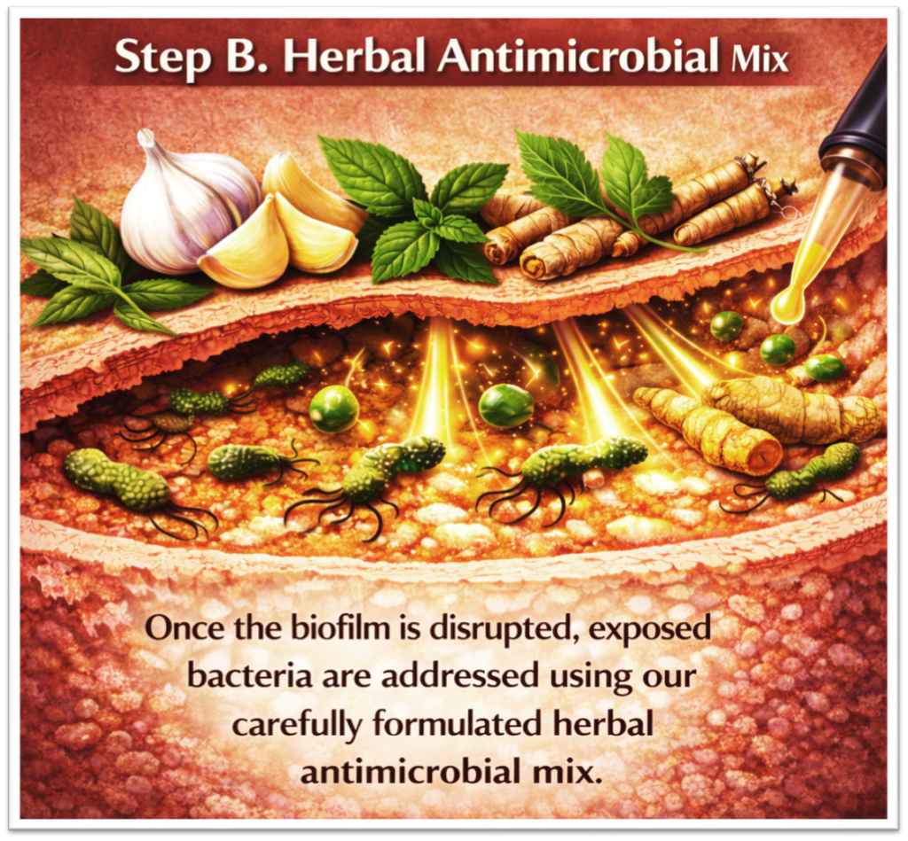 Step B. Once the biofilm is disrupted, exposed bacteria are addressed using our carefully formulated herbal antimicrobial mix.
