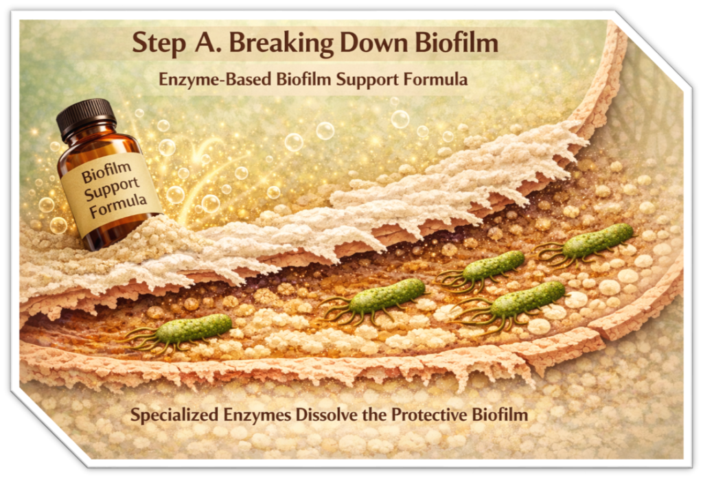 Step A. Our program begins with our specialized enzyme-based biofilm support formula, designed to gently loosen and weaken the protective barrier.